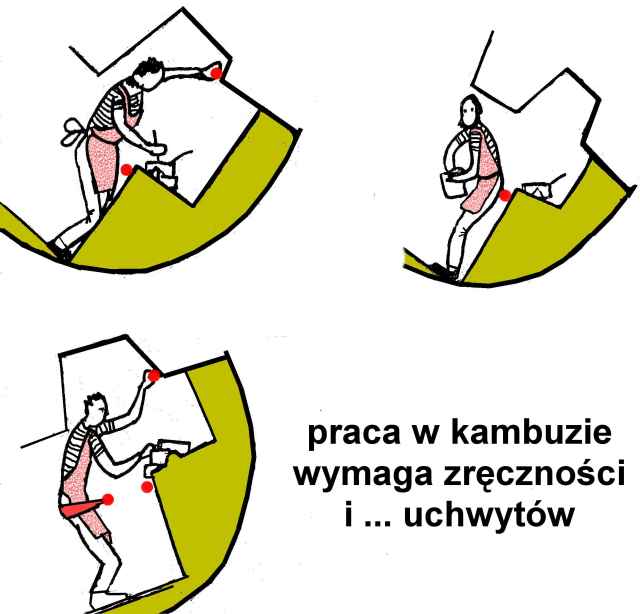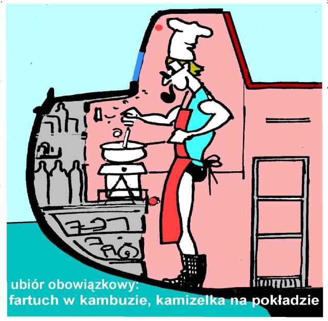 KUK: często w warunkach trudniejszych a więc bhpowsko wrażliwych na małych jachtach przy małej załodze kuk działa w tzw. międzyczasie i przy okazji a więc w sztormiaku wtedy ten fartuch jest jakby nieniezbędny. W takich warunkach też raczej używa się garnków do podsmażania i nikt chyba nie używa patelni z "niską wolną burtą" do podgrzewania oleju. Na inną rzecz warto zwrócić uwagę, bo na rozkołysie to mało jest chętnych na jedzenie a jeszcze mniej na wykwintne gotowanie. Wtedy podstawowe znaczenie ma obsługa czajnika z wrzątkiem. Te magiczne gorące kubki, chińskie zupki, kawa i herbata. Lanie wrzątku do naczyń, misek to jeszcze jescze ale do termosu to jest wyczyn i trzeba opanować sobie lokalną technologię mocowania termosu w zlewie tak aby trzymając się czegoś trafić w dziurę i nie olać całej okolicy włącznie ze sobą. Jest jeszcze jedeno dziecko kambuza trudne do opanowania. Ale to tylko od października do maja. Grzane wino. Wymaga grzania w garnku i przelania do kubeczków. A grzeje je się kiedy jest zimno a więc wieje i faluje.
