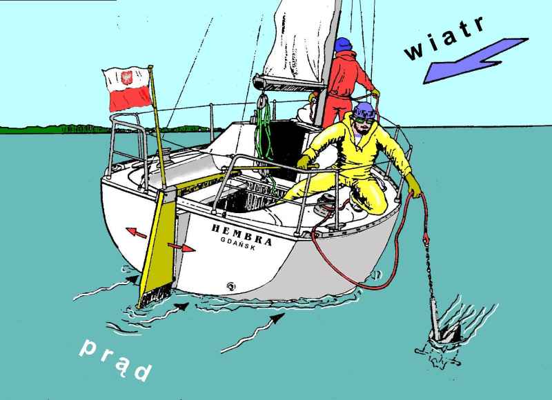 Ostatnim z wybranych temacików jest kotwiczenie na prądzie. Zasady kardynalne: pod wiatr, pod prąd. Hmm, ale czasami wiatr i prąd nie są w zgodzie ze sobą. No cóż - trzeba uszanować silniejszego.