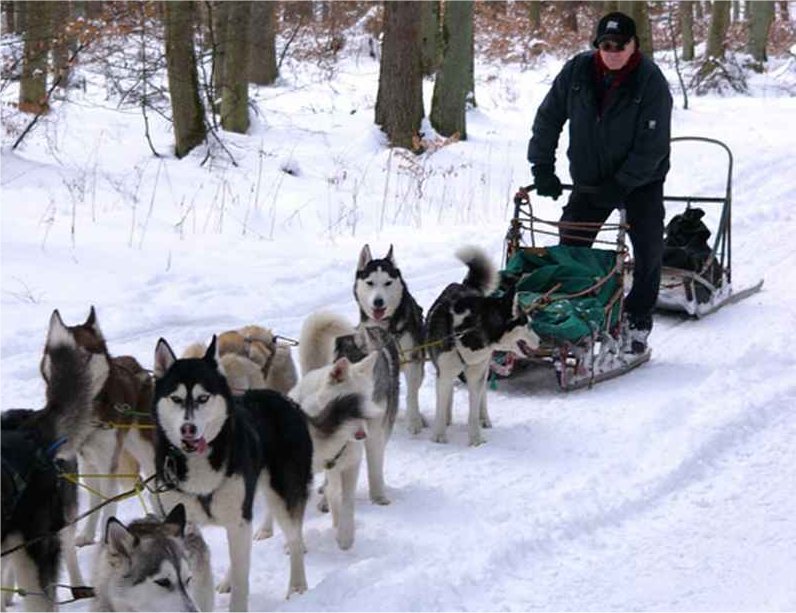 Na początku nastąpił pokaz ustawiania psiego zaprzęgu: „Szary” – psi przewodnik wpinany jest najpierw solo na czoło zaprzęgu, a potem pieski dobrane parami. Razem 13 sztuk. Żona z córką usiadły w pierwszych sankach prowadzonych przez Roberta, a ja miałem zostać maszerem drugich.