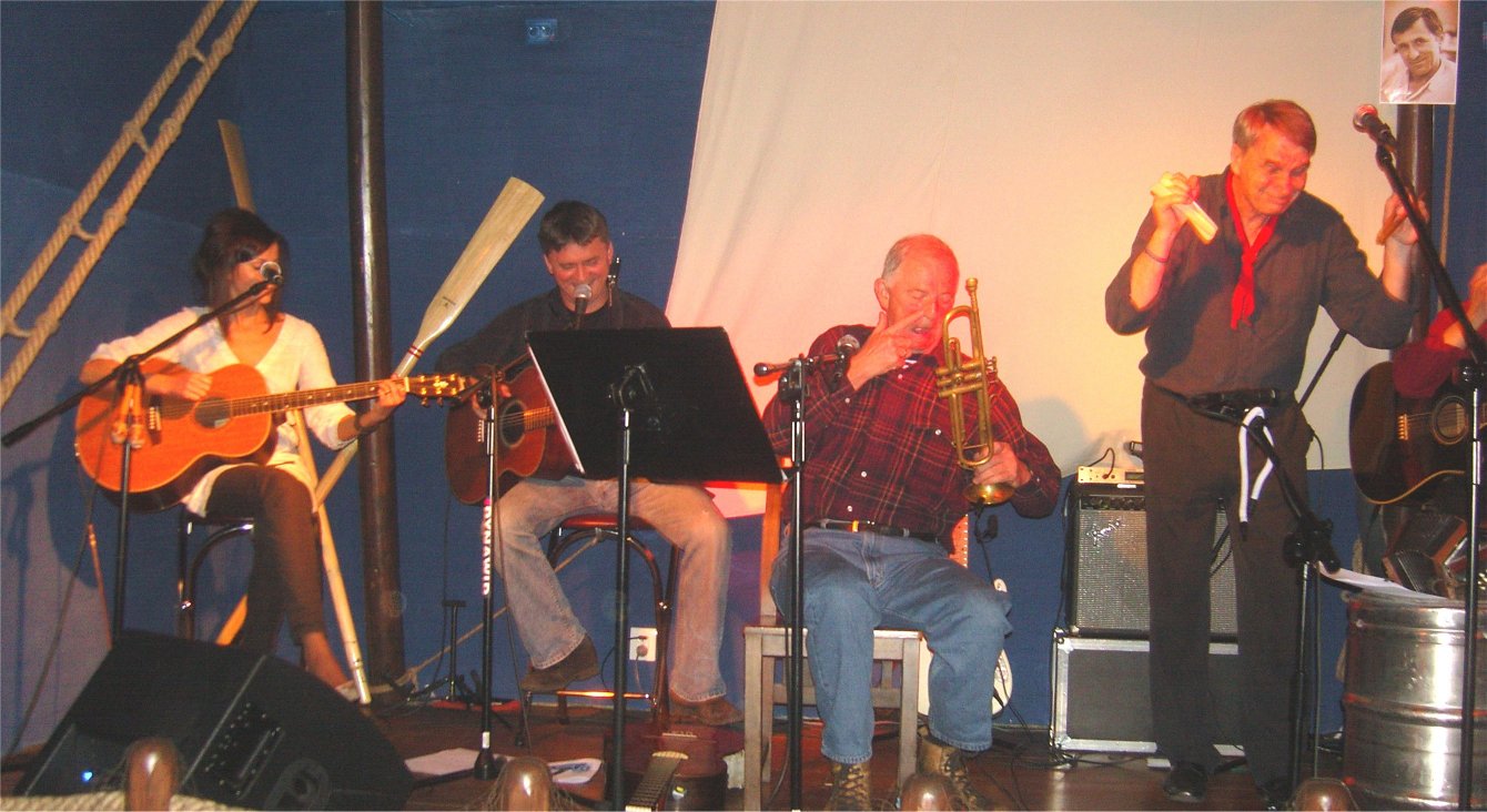 A później wystąpił legendarny zespół szantowy "Stare Dzwony" - Marek Szurawski, Jerzy Porębski, Ryszard Muzaj, Andrzej Korycki i Dominika Żukowska. Starzy to oni powoli (sądząc po upływie lat i przybywających zmarszczkach) to oni może już są. Ale zabrali z sobą wnuczkę Dominikę, a więc wizualnie też prezentują się doskonale. Ja o muzyce, jak wiecie - głosu nie zabieram, ale muszę przyznać, że oni na scenie bawią się tym graniem i śpiewaniem wcale nie mniej niż widowania. Paweł się cieszył z nami. Ale gdyby im wyłączyć nagłośnienie, to byłbym spokojniejszy.