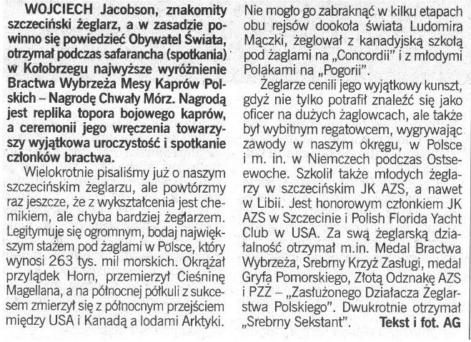 Gratulacje, gratulacje - mało komu Topór Chwały tak się należał jak kapitanowi Wojciechowi Jacobsonowi. Trochę się naczekał, ale tym bardziej powinien czuć się wzruszony. Wojtek Wejer przysłał skan lakonicznej notki gazetowej. Gdyby któryś z uczestników Zafarrancho w Kołobrzegu chciał temat rozszerzyć, to od tego jest rubryka "komentarze" (tekst do mnie mailem).