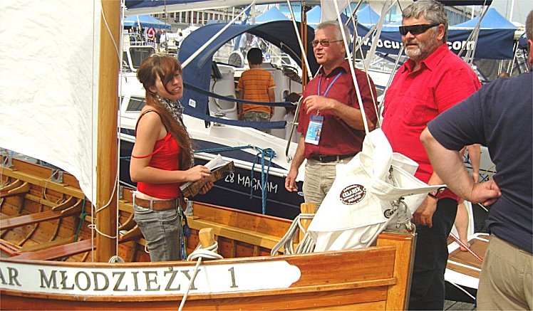 Z ukrywaną zazdością przyglądał się temu mistrz Aleksander Celarek, który niestety dotąd nie zwodował znanego wam już z dawnych newsów parostatku "Xiąże Xawery". Piłem piwo z Aleksandrem - susząc mu głowę prośbami, aby na przyszłorocznych letnich Targach W&W koniecznie go przedstawił szerokiej publiczność. W stosunku do "XX" są i inne plany, ale to najbardziej sekretne i niesłychanie prestiżowe przedsięzięcie. W międzyczasie ta znana firma szkutnicza z Mierzei wystawiła drewnianą łódz z napisem "Dar Młodzieży" (fot).