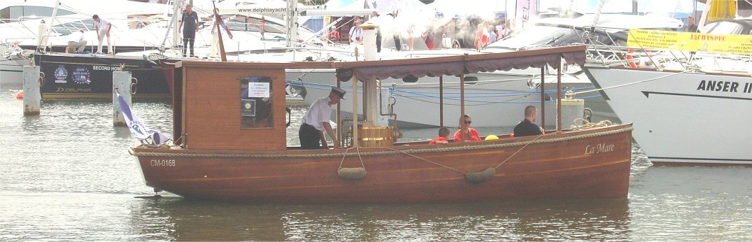 Co mi się spodobało? A więc ... parowiec rodem z Bydgoszczy (fot). Taki do obwożenia smakoszy piękna miast połozonych nad kanałami, rzekami lub nad jeziorkami. Wodna taksówka dla 12 (max) pasażerów. Drewniane toto, o długosci 7,7 m podobno potrafi rozwinąć prędkość do 7 węzłów podczas bezwietrznej pogody. Napęd (fot) stanowi jednocylindrowa maszynka parowa o mocy 6,5 KM. Kocioł parowy, opalany drewnopochodnymi brykietami (spalają się niemal doszczętnie) ma objętość prawie 100 litrów. Produkuje do 60 kg pary na godzinę - ciśnienie robocze 9 atm. Napęd pracuje bezszelestnie, biały dymek z komina dodaje uroku. No i można sobie pogwizdać (cała para w gwizdek) tyfonem "z epoki". Podczas Targów parostatek prowadził (po Basenie Jachtowym) najprawdziwszy, profesjonalny kapitan żeglugi śródlądowej w białym uniformie i złotem na galonach. Parowiec oraz zieloną miniaturkę dezety wystawiła firma "La Mare" - www.lamare.pl