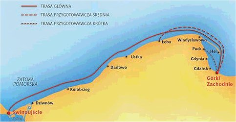 B. W szczycie sezonu lub na początku września można by rozegrać wyścig na trasie średniej dla bardziej wymagających zawodników. Ze względu na długość trasy, czas i poziom wysiłku - akceptowalny dla zwykłych żeglarzy marnujących sobie zdrowie siedzeniem w biurach przez resztę swojego życia. Należałoby liczyć się z wyraźnie niższą frekwencją niż wariant A, ale jeszcze wystarczającą dla stworzenia miłej atmosfery żeglarskiej rywalizacji.