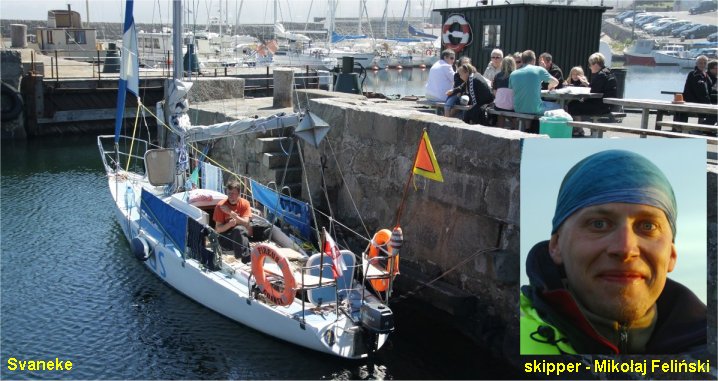 Jacht – pierwsza polska konstrukcja laminatowa, rok produkcji ok.: 1968.. Dł 9,4 m, szer 1,98 m. W środku nie ma "wysokości stania", kingstona, kuchenki na kardanie itp. Za wyposażenie nawigacyjne mieliśmy mapy wybrzeża polskiego BHMW oraz niemieckie Bornholmu, no i naturalnie przewodnik Jerzego Kulińskiego. Do tego dwa ręczne GPSy i radio do odbierania niemieckich prognoz.