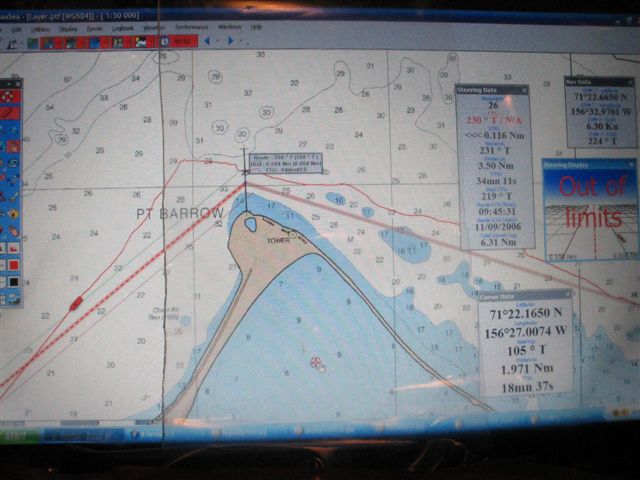 W dniu dzisiejszym, tj. 11 wrzesnia 2006 roku s/y "Nekton" plynac wspolnie z s/y "Stary" dokonali kolejnego wyczynu, a mianowicie przekroczyli Point Barrow - czyli najbardziej na polnoc wysuniety punkt Alaski a tym samym najbardzien na polnoc wysuniety punkt przejscia Polnocno - Zachodniego. Oto ich relacja: