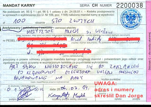 Mandat też mozecie sobie wydrukowac, aby skuteczniej się nabijać z potencjalnych wybryków władzy. Dane osobowe Krzysia wykreśliłem, bo teraz ludzie dostali nadwrażliwosci na takie informacje. Nawet w klatkach schodowych bloków poznikały spisy lokatorów, co zmusza mnie do rachunków dzielenia numeru mieszkania przez ilośc mieszkań na piętrze - tak aby ustalić na któryi guzik w windzie nacisnąć.