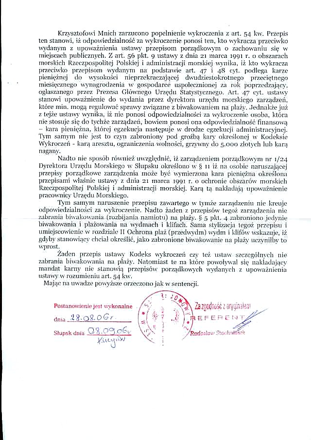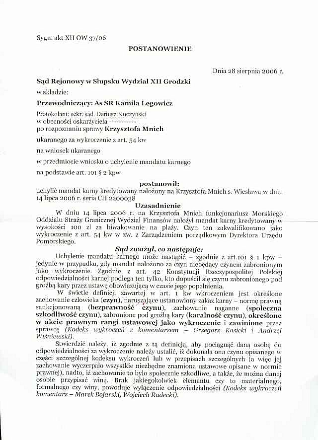 A więc Krzyś Mnich wygrał. To już wiecie, ale dziś podrzucam Wam corpus delicti, czyli skany POSTANOWIENIA niezawisłego sądu powszechnego, który uznał że Krzyś niczego złego nie zrobił, a władza nakładająca na niego mandat zgrzeszyła nadgorliwością. Jak to władza. Taka to jest moja opinia, a przecież chyba nie traktujecie mnie za anarchistę (w przeciwieństwie do Rady Starców z Chocimskiej). A teraz do rzeczy - prosze przygotować sobie drukarki i obie strony POSTANOWIENIA wydrukować i wkleić do wspomnianego na wstępie kajetu. Nigdy nie wiadomo, czy wszystkich nadgorliwców o tym werdykcie sądu już powiadomiono.
