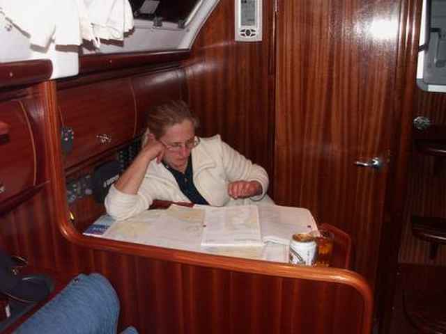 Uczestniczka rejsu Ewa Wiącek w nawigacyjej nad mapami