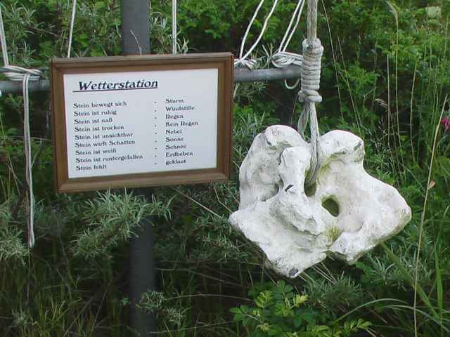 Ale wracajmy do meritum, czyli do grossenbrodzkiej STACJI METEO. Na fotografii widzicie dość fikuśny wiszacy kamień. A obok "klucz" interpretujacy wskazania tego przyrządu. Marek Zwierz przetłumaczył komunikaty. Obu Kolegom bardzo dziękuję. Edward sugeruje naśladownictwo. Myslę, ze na polskiej tablicy powinno zostać umieszczone źródło. A więc: