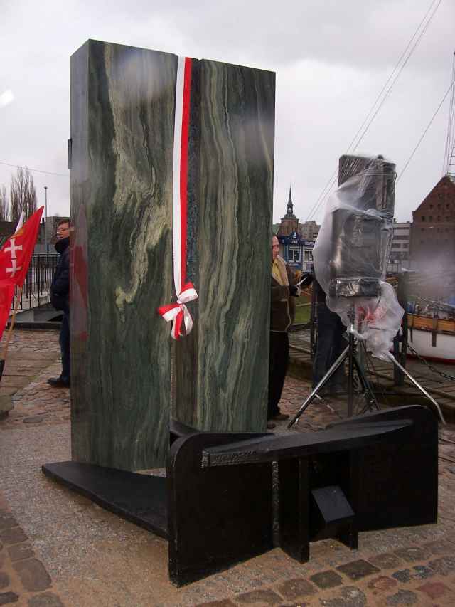 Pomnik jest ascetyczny w formie. Oszlifowany i wypolerowany, zielony prostopadłościan ze skały bałtyckiej, o który zahaczyła kotwica. Wielka, patentowa, prawdziwa - wydobyta z promu "Heweliusz". W uroczystości wzięło wielu oficerów obu marynarek, rodziny ofiar morza i władze miasta. Z żeglarskiej społeczności wypatrzyłem Teresę Szpetulską oraz Jana Talika..
