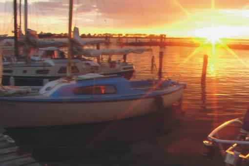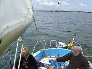 Wiatr 2-3 B, czasem mocniejszy szkwalik. Płynę w kierunku Fehmarn. Tam zadecyduję, którędy popłynę do Ustki. Koledzy doradzali, aby płynąć przy wybrzeżach niemieckich, ale mam większą ochotę na Danię i Szwecję. Parę mil od Wendtorf pakuję się w poligon. Oglądałem na mapie jego granice, ale płynę za innymi jachtami niemieckimi. Widzę, jak przede mną okręt strażniczy zawraca kolejne jachty. Podpływa i do mnie i coś mówią przez megafon.. Pokazuję, że nie słyszę, ale posłusznie włączam silnik i uciekam w lewo. Po jakiejś godzinie silnik stop i płynę na samych żaglach. Pod wieczór, gdy widzę w oddali most Fehmarn, wiatr całkiem cichnie. Mija mnie wiele jachtów na silnikach.W końcu i ja uruchamiam te konie mechaniczne, przechodzę pod imponującym mostem (20 m. wysokości) i płynę w prawo, do mariny Grossenbrode Fahre. Szybko cumuję i wyskakuję z kamerą i aparatem fotograficznym. Zdążyłem uchwycić zachód słońca pod mostem.