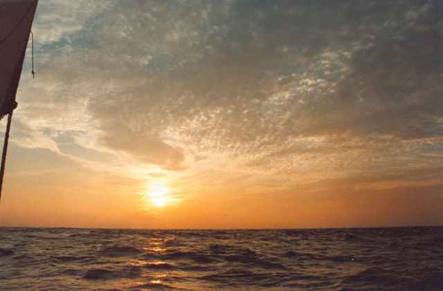 Środa, 20 września. Prognoza nie sprawdza się. W nocy zachodni wiatr wzrósł do siódemki. Wydaje mi się nawet, że fala większa i bardziej złośliwa. Może to wpływ Ławicy Słupskiej? W dodatku ten ruch statków, gorszy niż na autostradach żeglugowych. Czasem bardzo blisko jest ich kilka. Niekiedy oba światła pozycyjne widzę tak blisko, że nie wytrzymuję nerwowo i mimo fali uciekam w bok. Jeden i drugi statek przechodzą tak blisko, że mógłbym porozumieć się krzykiem. Odległy o parę mil prom zachowuje się tak, jakby miał awarię steru. Krótka, bałtycka fala im nie szkodzi, ale dla mnie manewrówka na niej nie jest przyjemna. To nie czerwcowa sielanka. Utrzymuję jednak ogólny kierunek na granicę usteckiego poligonu. Rano mijam jego północno – wschodni kraniec i skręcam do Ustki. Podchodzę półwiatrem parę mil zastanawiając się, co robić. Locja ostrzega przed wpływaniem w trudnych warunkach; szczególnie przy zachodnim wietrze w główkach jest silny prąd. Ale wiatr miał siadać – zawracam na morze. Zastanawiam się nawet, czy z tym wiatrem nie popłynąć do Gdańska ... Na wysokości Rowów zawracam. Widzę fantastyczny wschód słońca – wynurza się z chmur w niesamowitej scenerii. Trwa to kilka minut i nawet nie ma czasu, aby ustawić jacht na samosterowność i wyciągąć kamerę i aparat. Kilka godzin czekam na morzu na tę zmianę pogody. Jednak wiatr jest stały a fala nawet rośnie. Decyduję się wchodzić – nie zostanę przecież na noc parę mil od domu! Ubieram kamizelkę, szykuję cumy i uruchamiam silnik. Żagle w półwietrze i boczna fala – ciężko pracuję rumplem aby ustawić się do większych fal. Kilkaset metrów od główek daję na silniku najwyższe obroty. Steruję bliżej zachodniej główki, ale fala i prąd znoszą mnie na środek – i jestem w porcie. Jakieś oklaski, jakieś okrzyki z falochronu. Nie patrzę, bo silnik nagle gaśnie i płynę na samych żaglach. W Ustce dobijam do stojącego przy kapitanacie holownika, żeglarze ze spotkanego w Nexo jachtu pomagają założyć cumy. Podchodzi ktoś z kapitanatu i SG ale muszą poczekać – wpierw żagle i trochę porządku na pokładzie. Jakaś para coś pyta po niemiecku, inni ze zdziwieniem: ten Niemiec mówi po polsku ... I jeszcze jedna uwaga, po której już wiem, że jestem w Ustce ... i mam ochotę zawrócić na morze bez względu na pogodę.