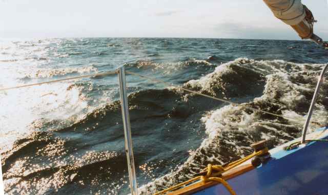 Niedziela, 17 września. O 2 w nocy mijam latarnię Olands Sodra Grund. Niesamowita noc. Ciemno, steruję na kierunek wiatru i tylko niekiedy świecę latarką na kompas, dla sprawdzenia. Lampa pozycyjna na koszu dziobowym co pewien czas zanurza się w wodzie, nadając jej czerwono – zielony blask. Niekiedy sprawdzam na GPS-ie kurs, pozycję i prędkość – 6-7 w.. Dziwne – nie jest mi zimno, chociaż nie mam jakichś ekstra sztormowych ubrań. Po wyprawie na dziób musiałem się przebrać – byłem cały mokry. Nawet jeść się nie chce, chociaż sobotni obiad nadal czeka na podgrzanie. Jednak wypiłem dwa litry mleka. Z sikaniem problem – trzeba do kokpitu. Siedzę przywiązany nie tylko linką, ale dodatkowo tak umocowany do osłony kokpitu, że nawet przy przechyłach nie muszę się trzymać.