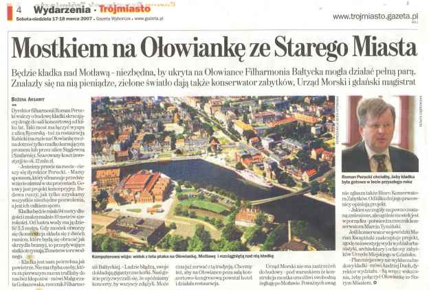 GAZETA TRÓJMIASTO datowana 17/18 marca donosi o chorym pomysle jeszcze jednej przeszkodzie nawigacyjnej. Tym razem w sercu Gdańska, tuż przed Mariną Gdańsk. Dyrektor Filharmonii zapragnął skrócić drogę melomanom. Kładka w poprzek Motławy, długa na 94 metry, szeroka na 10 metrów, o swietle 5,5 m. Otwierana dla jednostek pływających. Pomijając stronę konstrukcyjną i estetyczną - jest to pomysł niezwykle szkodliwy.Nawet szkoda mi czasu na uzasadnienie.