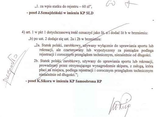 Poprawka czwarta zgłoszona przez Samoobronę o obowiązkowym przeglądzie i wpisie do rejestru dla jednostek czarterowych przepadła zdecydowaną większością głosów.