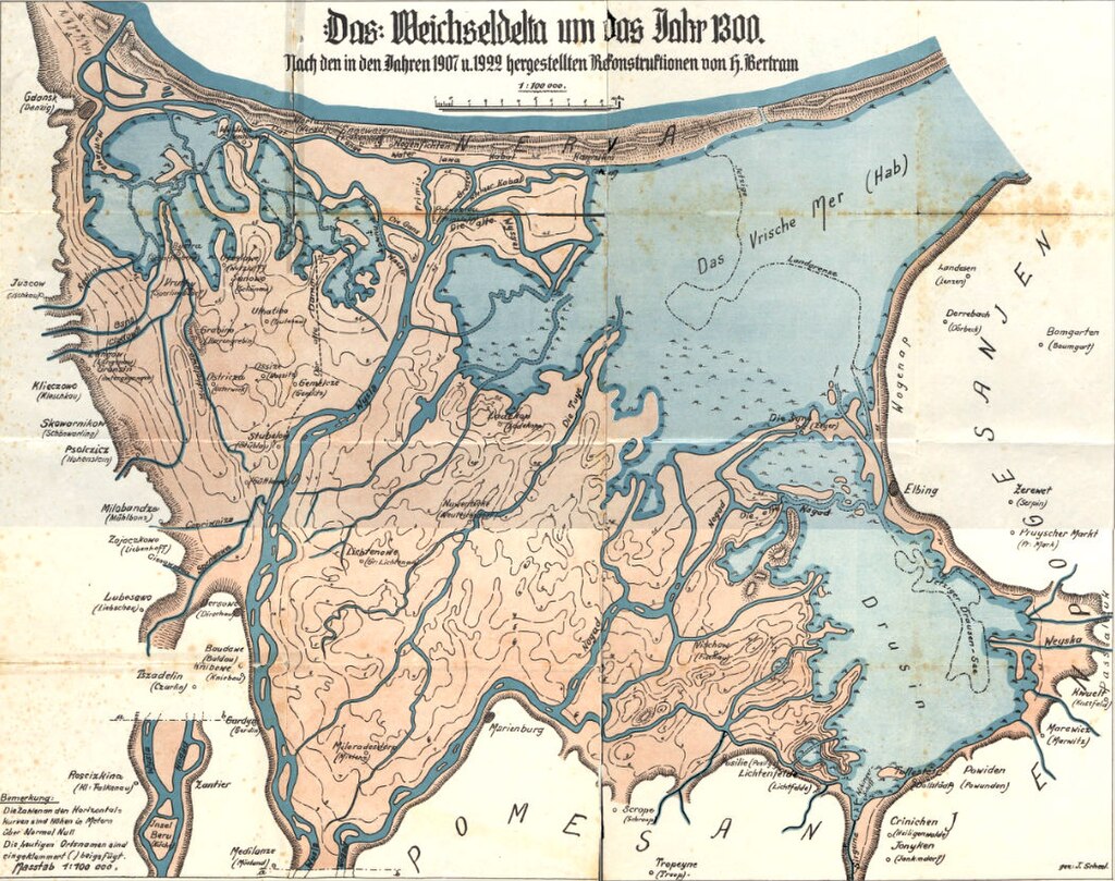 3. Mapa delty Wisły z Zalewem Wiślanym i Jeziorem Druzno z r. 1300.