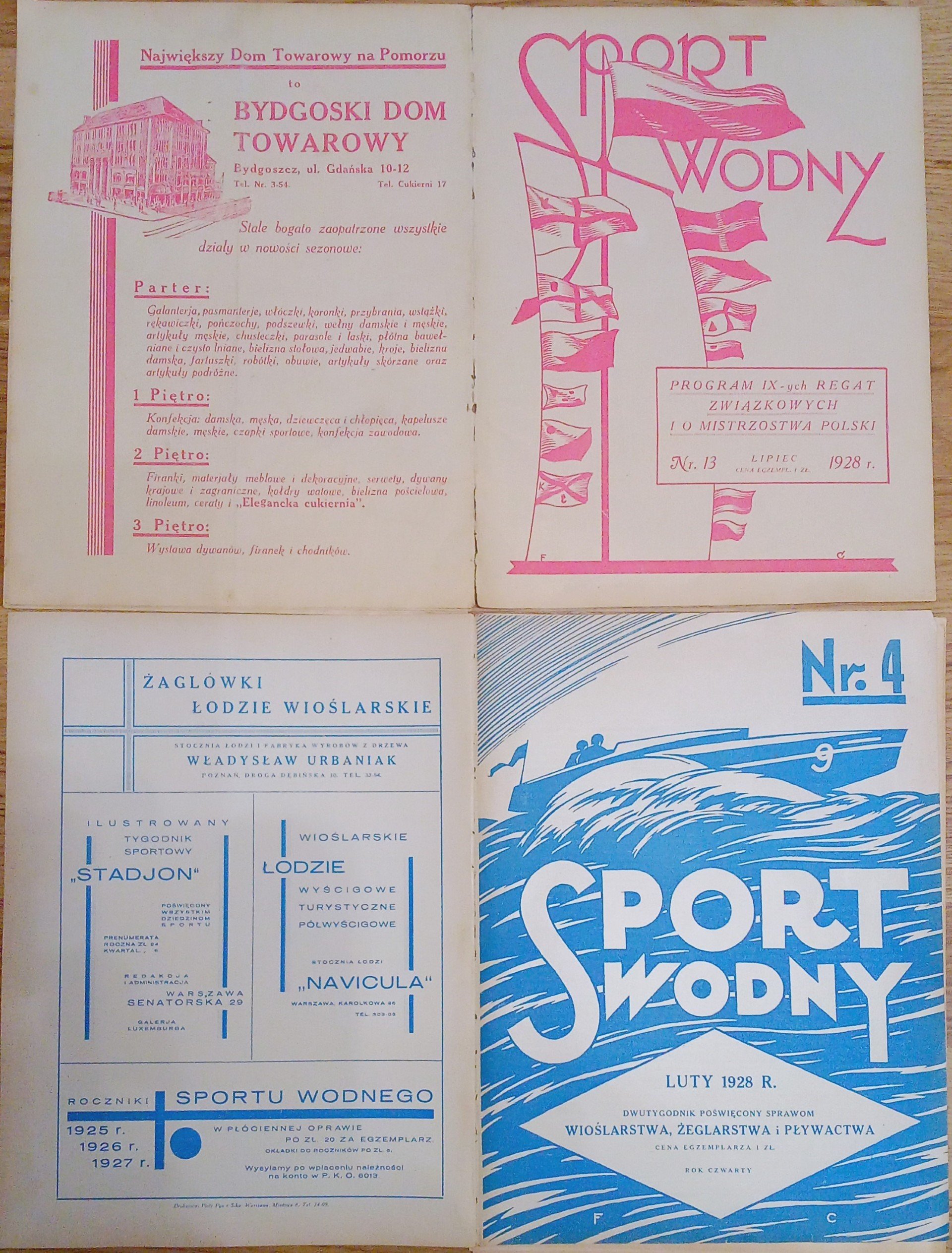 Relacja z rejsu O.R.P. „Wicher” na Maderę po Marszałka Piłsudskiego. Wiele zdjęć Marszałka i okrętu. Relacja w odcinkach rejsu „Daru Pomorza” do Ameryki \1931\. W kolejnych numerach jest też sporo informacji o koloniach. Polacy w Paragwaju, Kamerunie, Sudanie i Brazylii. Kolejny nabytek nie da się opisać w jednym zdaniu, to ponad trzydzieści numerów Sportu Wodnego z lat 1926-39. Miałem już sporo, ale te znakomicie wypełniają luki. Część niestety bez okładek, ale zawartość bezcenna. Jakość zdjęć dużo lepsza niż w powojennych gazetach. Tylko jak w kilku zdaniach opisać zawartość? Wiele informacji o klubach wioślarskich. Informacje o otwarciach sezonu, o budowach nowych siedzib klubów, o składzie władz. Dużo też o zawodach pływackich. Relacja w odcinkach rejsu jachtem „Carmen” do Danii, Szwecji i Norwegii. Dużo relacji z zawodów pływackich. Relacja z rejsu z Pińska do Wyszogrodu, Relacje z regat bojerowych w Tallinie. Zdjęcia bojerów pojawiają się wielokrotnie. Pierwsze regaty morskie w Polsce \1933\ trasa Gdynia – Bornholm. Jachty startujące w regatach: „Jurand”, „Chochlik”, „Witeź”, „Mohort”, „Temida Dwa”, „Halina”, „Flondra”, „Orion”, „Irka”. Komisja Regatowa płynęła na O.R.P. Smok, podczas startu był nawet na pokładzie admirał Unrug komandor YKP. Relacja w odcinkach z rejsu przez Atlantyk A. Bohomolca i J. Świechowskiego na jachcie „Dal” \1933\ Relacja z rejsu kajakiem z jeziora Narocz \największego w Polsce… \ do Nowego Dworu, trasa przez