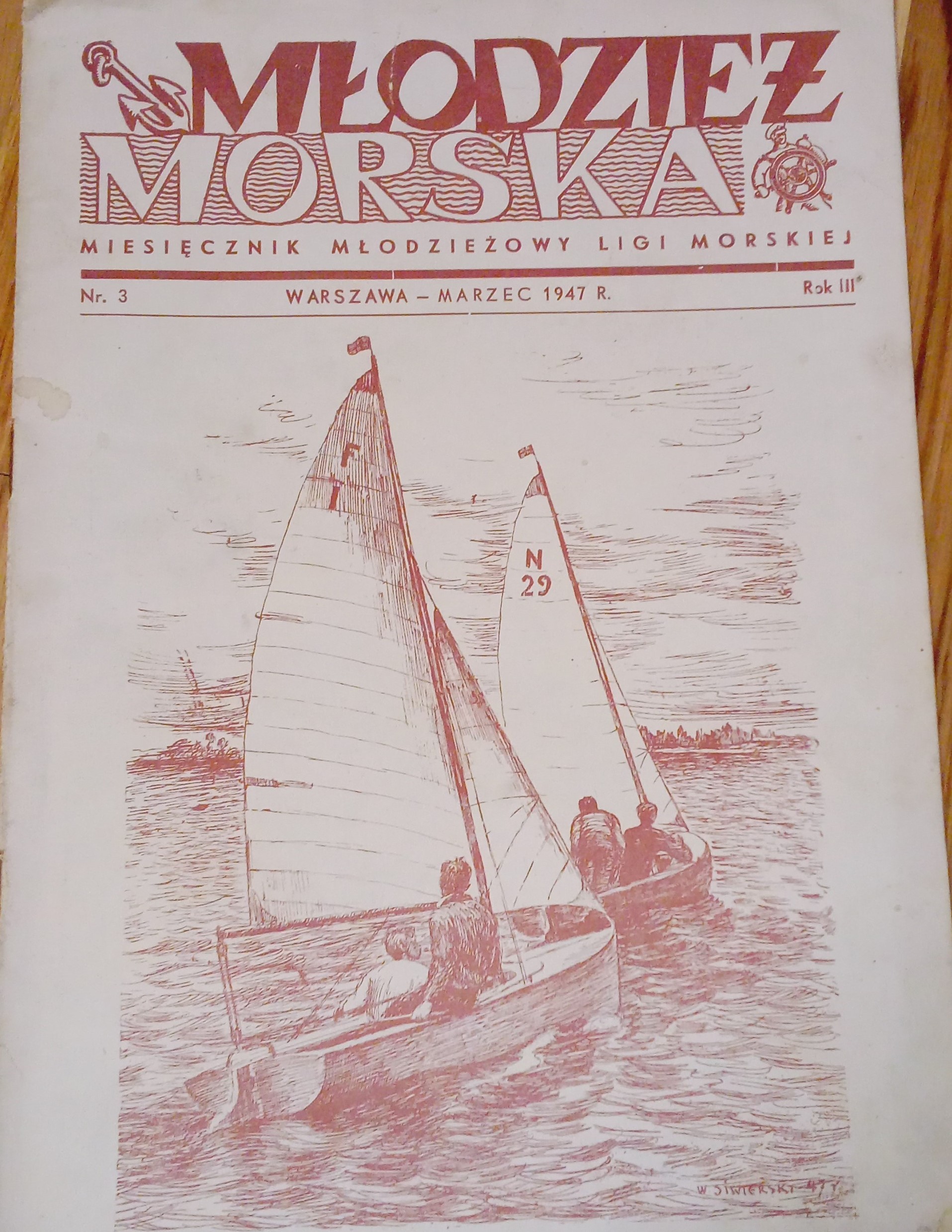 Część trzynasta, ale nadal nie wyczerpuje tematu, znowu pozyskuję ciekawe zdobycze – warte opisania. Chyba trochę spowodowałem zainteresowanie marynistyką, bo ceny wzrosły a na aukcjach spotykam się z konkurencją i trudniej coś wylicytować. W poprzednim felietonie pisałem o czasopismach „Żeglarz”, w 1948 roku połączono „Żeglarza” z „Młodzieżą Morską”. „Młodzieży Morskiej” mam kilkanaście numerów i właśnie zdobyłem kolejny 3/1947. W nim jak zwykle niewiele żagli, ale okładka przyciąga rysunkiem żaglówki. Pierwszy artykuł: fakty dziejowej doniosłości… Bolesław Bierut został prezydentem, bezsprzecznie jedna z najpiękniejszych postaci naszego wieku… \cytat z artykułu\ Od 1956 krążyło powiedzenie o jego ostatnim wyjeździe do Moskwy: pojechał w futerku, wrócił w kuferku. Starsi rozumieją, młodsi niech sobie sprawdzą, jak skończył towarzysz Bierut. Był artykuł o pracy nurka, o wyznaczaniu pozycji, barometrach i termometrach. Pierwszy kurs żeglarski na Ziemiach Odzyskanych rozpoczęto 19 lipca 1945 w Postominie. Dojazdu jeszcze nie było i uczestnicy musieli przyjść pieszo ze Słupska. „Młodzież Morską” połączono z „Żeglarzem” zmieniając tytuł na „Młody Żeglarz”. Pierwszy numer wydano podwójny: styczeń/luty 1949, wydawcą była organizacja Służba Polsce. Taki wydawca to i tematy łatwo zgadnąć. Pierwszy artykuł to: 31 rocznica armii pokoju… kolejne poruszają tematy morskie, żeglarstwo pominięte. Pierwsza rocznica ZMP z wizerunkiem towarzysza Bieruta to też artykuł typowo żeglarski, na osłodę zdjęcia jachtów z klubu żeglarskiego ZMP „Zryw”.