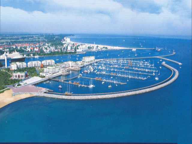 Architektura zabudowy zupełnie mi się nie podoba. Jakoś pachnie mi Jałtą i socrealizmem. Moim zdaniem nie pasuje ani do Niemiec, ani do Bałtyku. Ciekawostka nautyczna - uwaga na podejsciu. Podchodząc od północy - światła wejsciowe zobaczycie "od kuchni", czyli czerwone po prawej. Do przeczytania w ŻAGLACH.