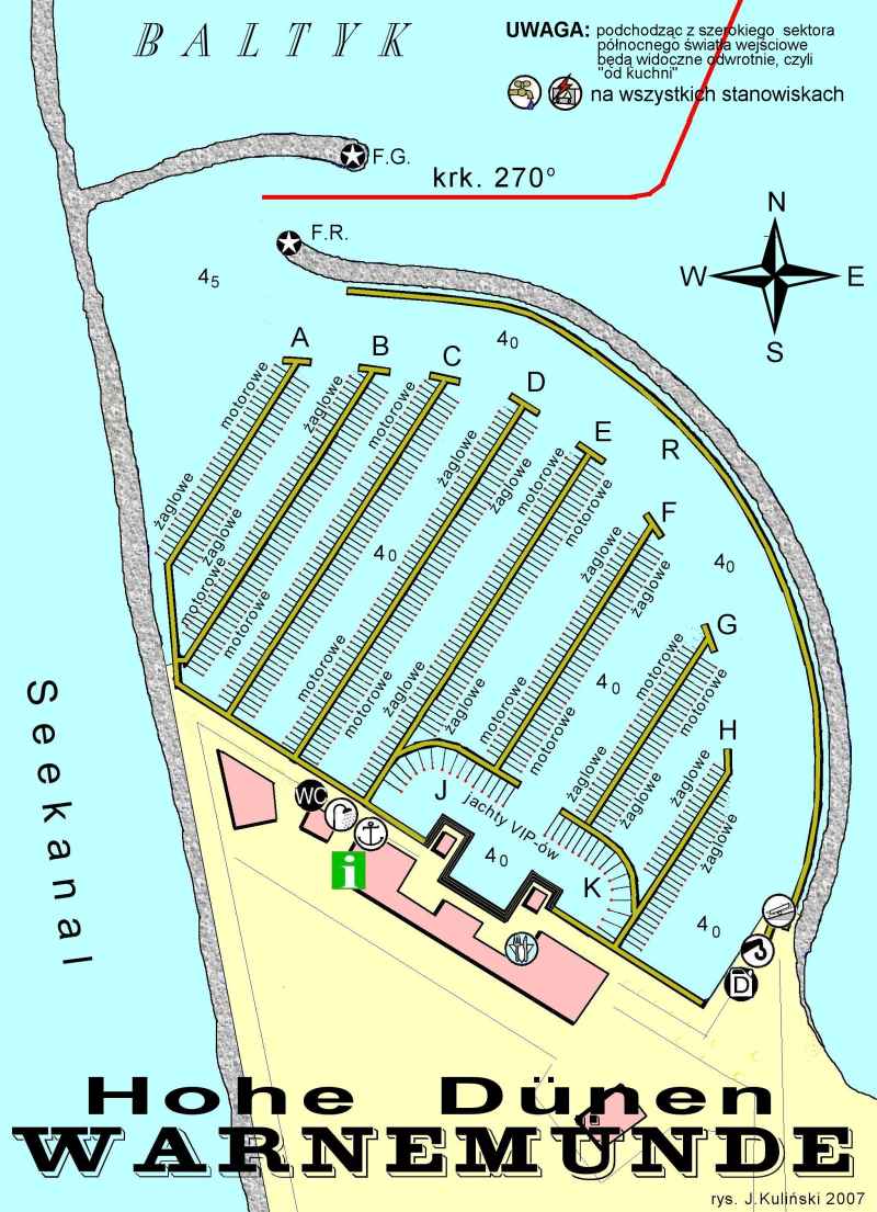 To znaczy - własnie wróciłem z Niemiec, gdzie byłem na robotach. Pojechałem moim zabytkowym camperkiem, zabierajac z sobą sprzęt fotograficzny, laptopa i ... żonę. Obejrzałem, obrysowałem i obfotografowałem sporo portów, porcików i przystani między Świnkowem i Warnemunde. Będzie z tego serial w ŻAGLACH. A dziś, tylko na przynętę podrzucam okruchy z przywiezionego materiału. Za najbardziej atrakcyjny uznałem nowy port jachtowy w Warnemunde, a właściwie w Hohe Dune (wysoka wydma), czyli na wschodnim brzegu rzeczki Warnow. Do tej pory tylko obok przepływałem - przez lornetkę oglądając postęp robót hydrotechnicznych. Teraz przybyły obiekty lądowe. Sporo tego, i to na wysoki połysk.