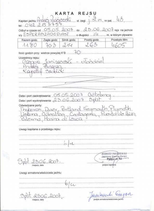 Wypłynęliśmy 05.05.2007 z Goteborga i do Splitu zawinęliśmy 21.06.2006.Ale ja juz tam chyba nie popłynę.Bałtyk to prawdziwe morze a szkiery Sztokholmu są o wiele piękniejsze niż wypalone słońcem wysepki Chorwacji.A ceny tez kosmiczne.Postój w Palermo to wydatek 110 Euro za dobę.Kogo stać na to niech żegluje.Grzegorz Janiszewski pozostał w Splicie gdzie zamierza sie opalać i wypoczywać w słońcu południa.
