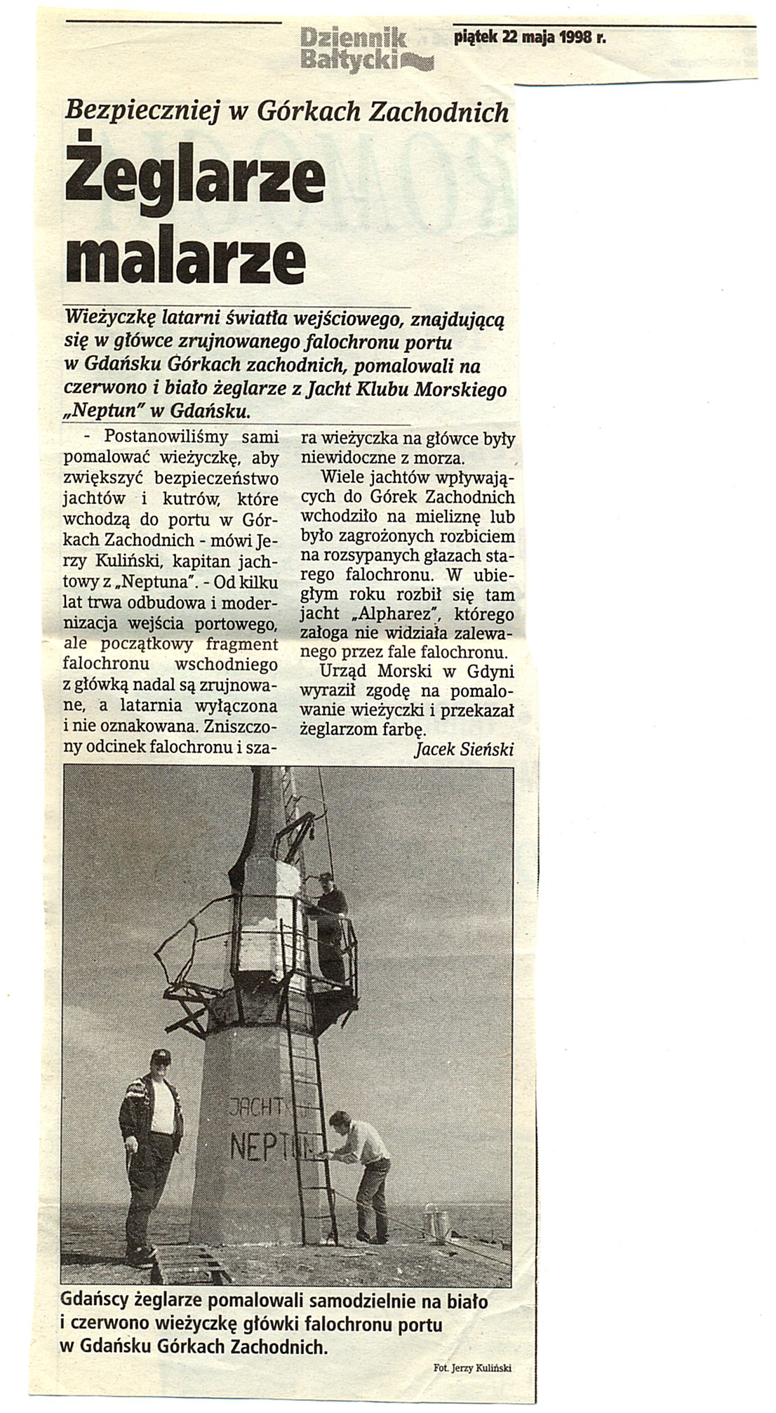 A na koniec stara fotografia przedstawiajaca żeglarzy z Jachtklubu Morskiego NEPTUN - malujący poprzednią wiezyczkę wschodniego falochronu w Górkach. Urzad Morski mówiż, że pomalować nie moze, bo na dnie dookoła głowicy zalegają niebezpieczne głazy. No to pomalowaliśmy. Niestety dopiero po zagładzie jachtu "Alpheratz"
