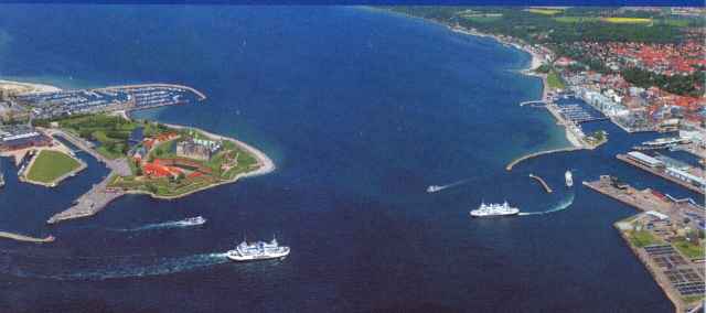 Płynąc blisko falochronów skracasz długość „skoku”, w którym mógłbyś spotkać się z promem. Jedyny szkopuł polega na tym, że parapety falochronów są wysokie i utrudniają obserwację. Jeżeli wychylając się z „cienia” falochronu zobaczysz wychodzący prom – błyskawiczny powrót do bezpiecznej strefy nie stanowi problemu. Dobrze przyjrzyj się mapce na stronie 110. A teraz dołączam fotografię lotniczą tego pięknego akwenu.