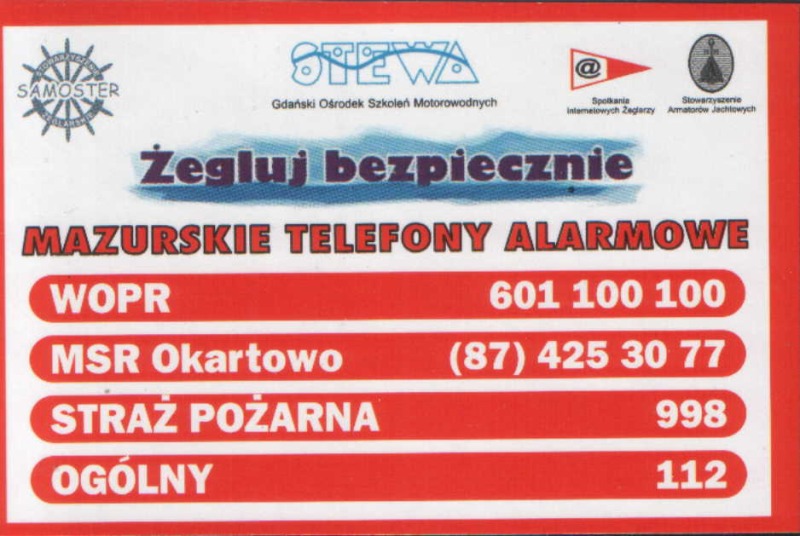 Niezamożne, oparte o wolontariat "alternatywne" stowarzyszenia bezpieczeństwem zeglugi przejmują się więcej niż ... no wiecie. Niedawno był news o projekcie "manewrów ratowniczych z SAR". W zeszłym roku rozdawane były naklejki "alarmowe" dla słonej wody. Dziś przedstawiam wam nową, samoprzylepnną, wodoodporną, gratisowo rozdawaną plakietkę dla Jezior Mazurskich. Co chwile jakiś souvenir od SAMOSTERU, STEWY, SIZ i SAJ. A Chomska tylko o uprawnieniach, przeglądach, rejestracjach .....