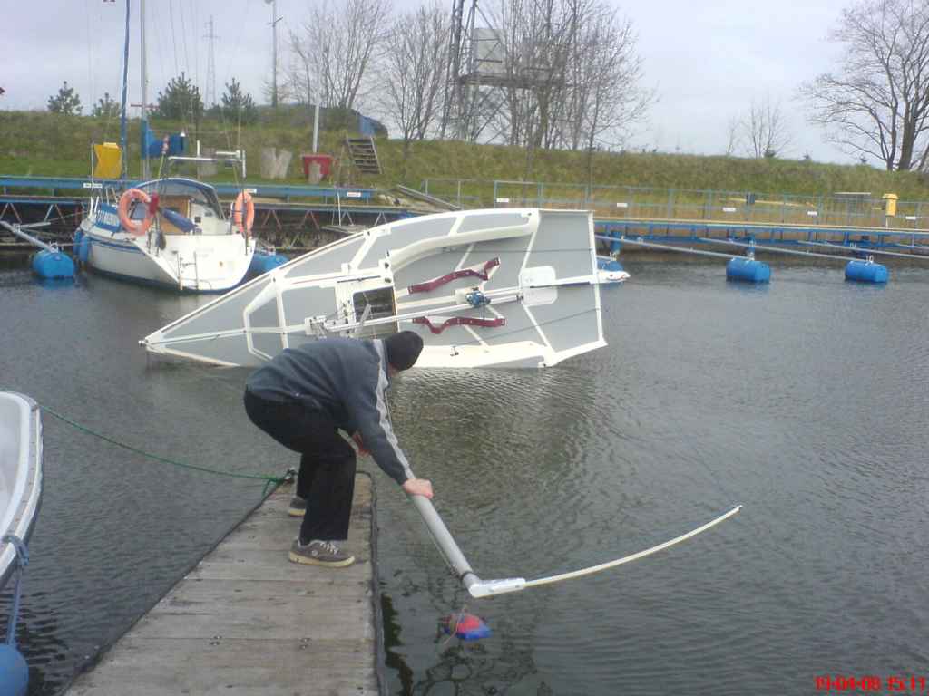 W sobotę 19.04.2008 Jachtklub Morski NEPTUN gościł swego przyjaciela Piotra Adamowicza, który i tym razem uświetnił naszą przystań wodowaniem i próbami technicznymi swego najnowszego wodnego bolidu regatowego, czyli jachtu Klasy "ŻAGLE 500" o zagadkowej dla mnie nazwie "D V M" (POL 7119). Jest to drugi jacht taj klasy typu CORS 500 nr bud. 3, konstrukcji mgr inż. budowy okrętów Piotra Adamowicza. W porównaniu z prototypem kadłub jachtu jest z negatywowej formy (burty przekładka, dno na włókninie Firet, pokład, zabudowa wnętrza to 100 % przekładka wykonana najbardziej pracochłonną metodą "ONE-OFF". Budowniczym był osobiście konstruktor przy wydatnej pomocy stoczni MARE w Cedrach Małych pod Gdańskiem.