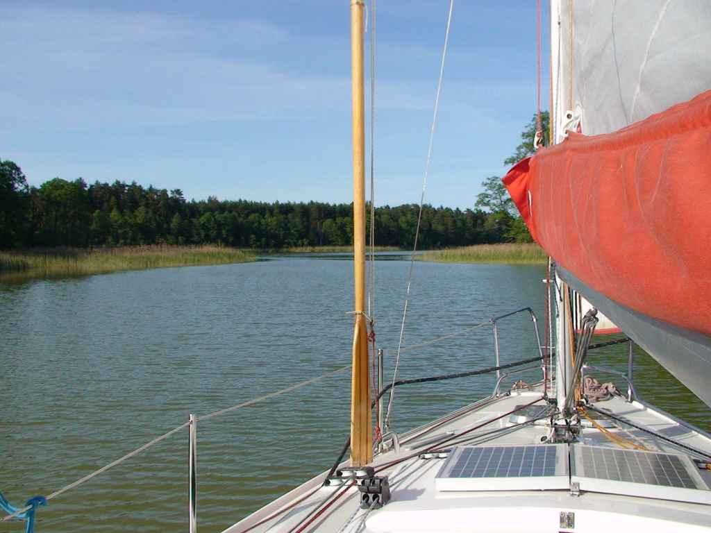 A teraz o samym żeglowaniu. Wiało bardzo sympatycznie i mieliśmy naprawdę dużą radość z żeglowania. Mieliśmy, bo pływałem razem z moim kumplem, Sławkiem Orkwiszewskim. Razem, ale też i osobno, bo ja sam na swoim „Szamanie”, a Sławek sam na swojej „Panta Rhei”. Wyruszyliśmy z Karwicy i opłynęliśmy Nidzkie od portu „Pod Dębem” aż do Jaśkowa na jego samym końcu, tam gdzie Wiartelnica wpada do Nidzkiego. Podrobiliśmy trochę zdjęć, również sobie nawzajem, bo rzadko kiedy ma się zdjęcia od strony wody.