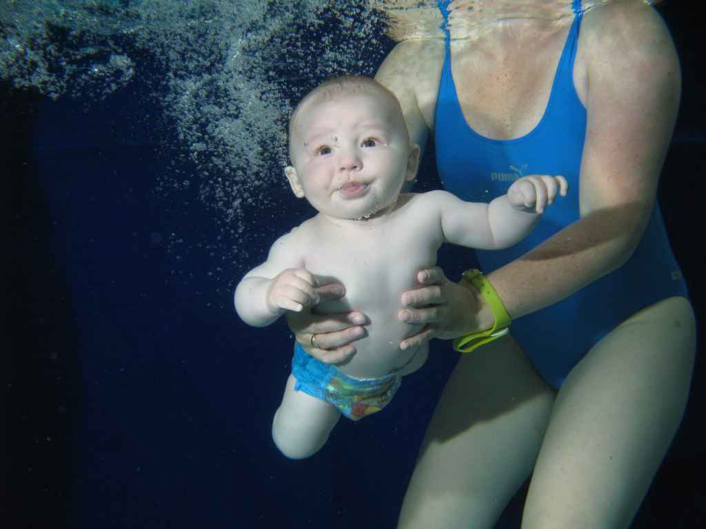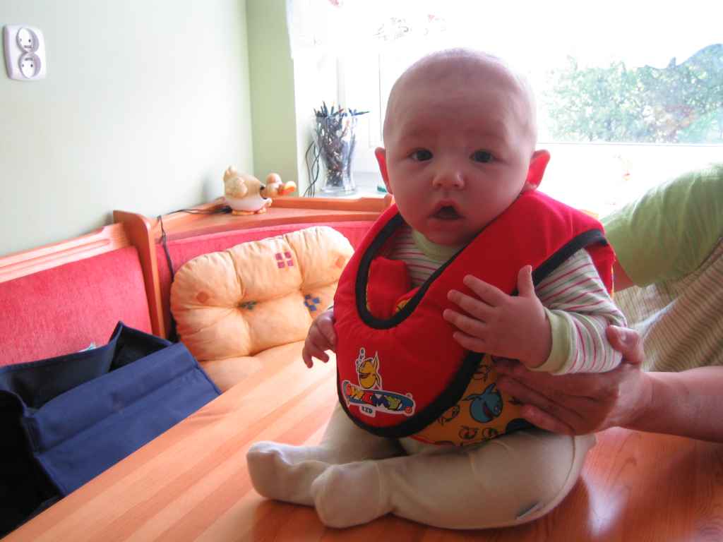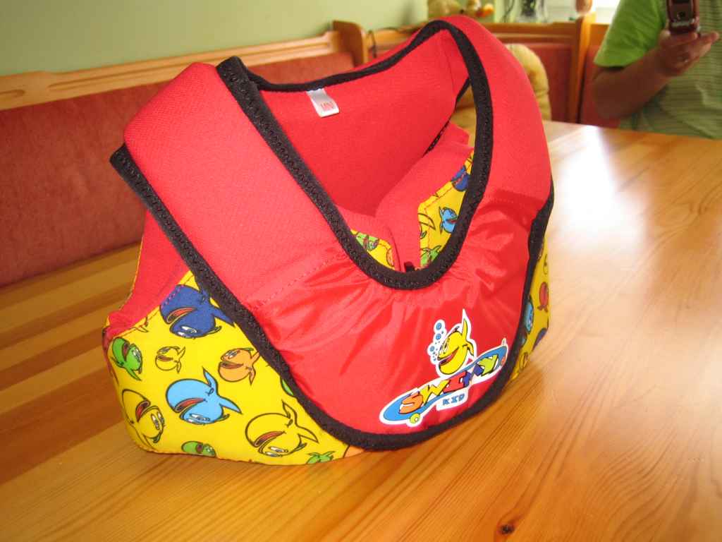 Podrzucam Wam 3 fotki. Zobaczcie jak mama zanurza Kacpra, jak wygląda pierwsza kamizelka malucha i jak w tej kamizelce Kacper się prezentuje. To jest sposób, aby Kacper od maleńkosci z kamizelką się zaprzyjaźnił. Dobry przykład.