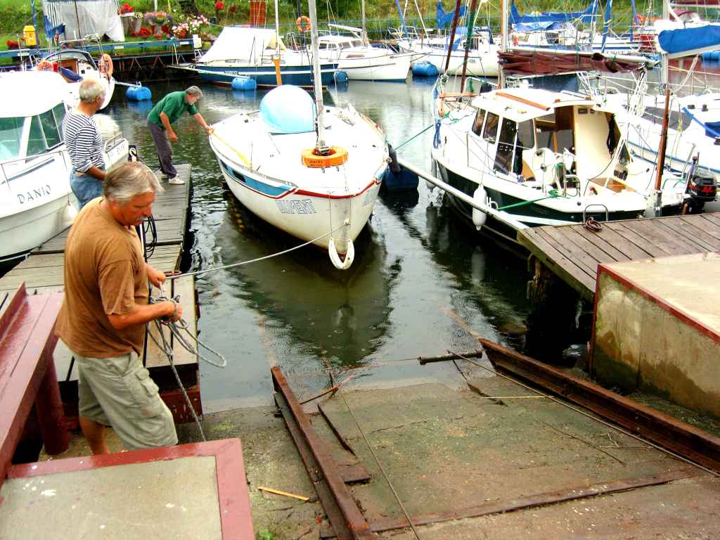 Przeszło 20 lat temu Stefan Wysocki wydał za pieniądze państwowego wydawnictwa broszurę reklamującą prywatnego przedsiebiorcę. Tytuł broszurki - "Rodzina Maków". I tam wtedy zobaczyłem szuwarową maszyne regatową "MAK 707 GTK". A teraz po tylu latach miałem okazję obejrzeć ów jachcik w "realu" (ach ta nowomowa!). Miałem więc okazję pewnego deszczowego dnia asystować w wyciaganiu "Diamenta" z wody na naszym podnosniku. Specjaknie pisze podnośniku, bo genialna, unikatowa konstrukcja Henryka Brylskiego bardziej przypomina synchrolift niz wyciąg. Warto abyscie przyjrzeli sie jak wygodnie i bezpiecznie przebiega taka operacja. Przy okazji popatrzcie na "kanał obsługi mieczy" (po lewej stronie). Na tym stanowisku skrobie się i maluje oraz wymienia nadwątlone stropiki mieczy sektorowych.