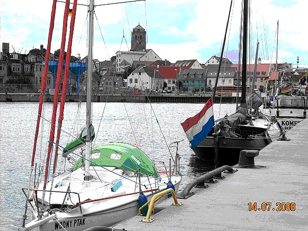 Obawiałem się wejścia do Ustki w tych warunkach, ale mały fok + silnik i już jesteśmy w porcie. Spotykam „starych samotnych” żeglarzy Romka i Edka .Następnego dnia płyniemy dalej na Zachód , razem z Edkiem , on na HOLLY ja na Wodnym Ptaku , w dobrym czasie ze średnią ponad 5w, dopływamy ja do Dziwnowa a Edek pod Świnoujście. Pogoda jest zmienna , nawet na Zalewie Szczecińskim koło Wolina tak wieje spod chmur burzowych , że dwa razy wlecze mi kotwicę raz przed mostami na wejściu da miasta ,a drugim razem przy Wzgórzu Wisielców . Trzecia burza tego samego dnia łapie nas na zalewie ,ale dajemy radę i płyniemy dalej do Stepnicy. Tu stoimy 3 dni ,znowu wieje z Zachodu czasem do 7 B, ale są mile spotkania ,żeglarze , rybki, piwko.