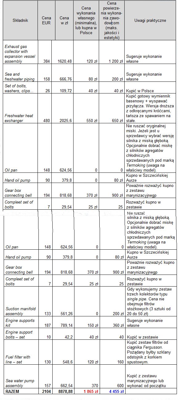 Zestawienie to powinno być interesujące ponieważ pokazuje trzy równoważne funkcjonalnie opcje marynizacji – chociaż oczywiście koszty i nakład pracy są różne. Ceny wykonania zostały przeze mnie sprawdzone dla drogiej Warszawy, gdyż na potrzeby tego artykułu wykonałem trzy różne kalkulacje marynizacji, aby odświeżyć sobie wiedzę. Do powyższych kosztów należy dodać cenę przekładni nawrotnej Hurth, która po uczciwej regeneracji w Kędzierzynie Koźlu (firma Kreator), wyniesie od 1200-1700 zł.
