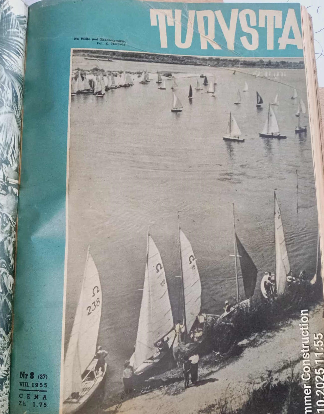 prac, ale jaka śliczna. Teraz model przyozdabia moje biuro. Kupiłem kilkanaście locji, stare i nieaktualne, ale przedwojenne i stan znakomity. Najstarsza z 1925 roku. Rozpisuję się o wielu różnych gazetach, ale faktyczną skarbnicą wiedzy są roczniki „Żagli”. Trudno opisać szczegółowo, ale przeglądając starsze roczniki ciekawi wszystko. Nie piszę o nich, bo mam komplet to nic nie przybywa, ale to najbardziej żeglarska gazeta ze wszystkich. Najstarsze roczniki przeczytałem, ale przerwałem, bo później było coraz ciekawiej. Dużo zdjęć i opisów rejsów. Może na emeryturze będę miał tyle czasu by całość przeczytać. Stale przeglądam ogłoszenia, ale mam dużo i coraz trudniej znaleźć brakujące pozycje. Trochę zdublowanych czasopism i książek o Marynarce Wojennej wywiozłem z biblioteki do domu i co jakiś czas dowoziłem kolejne gazetki… Nie wiem jak to się stało, ale kolejne pięć regałów się zapełniło. Kupiłem zdjęcie oficerów z Flotylli Pińskiej, wśród nich stoi w centrum Generał Zaruski i Dowódca Flotylli Komandor Witold Zajączkowski. Przy okazji poszukiwania czasopism marynistycznych natykam się na różne inne stare gazety. Zdjęcie jachtu na okładce to już istotna wskazówka. Zgromadziłem kilkadziesiąt numerów miesięcznika Turysta. Było wydawane przez PTTK od 1951 roku. Porusza wszelkie rodzaje turystyki, ale kajaki i żeglarstwo też zajmuje sporo miejsca. Zdjęcia dziś już archiwalne utrwaliły nam tamtejszą rzeczywistość. Relacje ze spływów po zapomnianych już szlakach kajakowych. W gazecie są zdjęcia z pochodu pierwszomajowego, turyści ciągną kajaki na wózkach… i pewnie machali do pierwszego sekretarza. Opis i zachwalanie jachtu żaglowego BM-ka, niby dla czterech osób do rejsów turystycznych. Też pływałem na jachcie podobnej wielkości. „Pirat” w cztery osoby, poznałem jaki to luksus… ale miałem kilkanaście lat, łatwiej było zaakceptować niedoskonałości jachtu bez kabiny. Niemniej miał też zalety, wpływałem nim dość łatwo na Gołdopiwo. Rejs z jeziora Niegocin na jezioro Ublik Mały to był mój olbrzymi wyczyn i mało osób może się poszczycić takim rejsem. Płynąc na Orzysz z Tyrkła nawet miejscowi się pukali w czoło, mówiąc: kajakiem ktoś tu płynął, ale łódkąąąą? \dopłynąłem\ W numerze 8/1954 jest opis