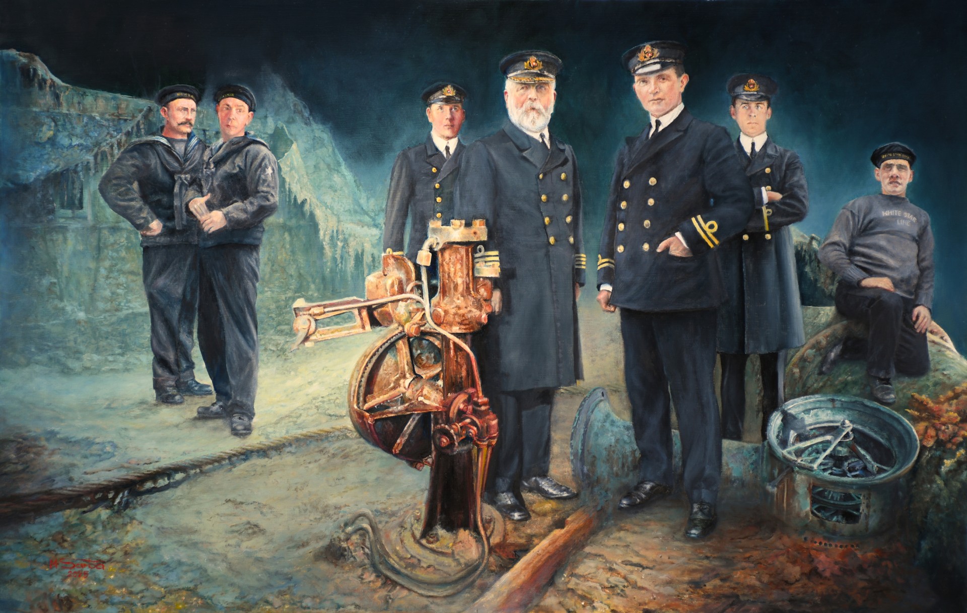 Po długim czasie postanowiłem namalować mój trzeci obraz na temat s/s „Titanic”. Projekt długo się nie urzeczywistniał. Wybrałem stanowisko dowodzenia, czyli mostek i sterówkę, miejsca, które znam bardzo dobrze z mojej osobistej pracy na morzu. Znajduje się tam również jeden z monumentalnych pozostałości statku, ponad 100 lat po zatonięciu, niemy świadek – kolumna telemotoru. Postanowiłem sprowadzić do miejsca ostatniej wachty wszystkich tych, którzy pełnili służbę, prowadzili statek i od których rozpoczęła się tragedia. Ostrzeżenie wydane przez obserwatora w połowie wachty - Freda Fleeta, który zadzwonił dzwonkiem alarmowym oraz zameldował telefonicznie na mostek „Titanica” z bocianiego gniazda: „Góra lodowa tuż przed nami!”, na zawsze zapisało się to ostrzeżenie w historii. Tylko otarcie się statku o górę lodową, delikatne nieznaczne dotknięcie masy lodowej pod linią wodną i przez następne dwie godziny i 20 minut najwspanialszy statek oceaniczny, jaki kiedykolwiek zbudowano, a 1522 jego pasażerów i członków załogi czekało na śmierć. Dodane do sceny na mostku elementy to: telegraf, który jest jednym z symboli sytuacji komend i część masztu dziobowego, który był miejscem obserwacji i głównie dodania postaci Fredericka Fleeta. Dochodzenie po wypadku nie obarczył nikogo winą osobiście i nie wyciągamy żadnych wniosków. Po prostu zaprosiłem całą załogę tej ostatniej wachty, aby przyjrzała się ich ostatecznemu wynikowi. Postacie są portretami. Patrząc od lewej: kwatermistrz/sternik Alfred Olliver, kwatermistrz/sternik Robert Hichens, szósty oficer James Paul Moody, kapitan Edward John Smith, pierwszy oficer William McMaster Murdoch, czwarty oficer Joseph Groves Boxhall i obserwator Frederick Fleet. Szczegółowe opisy portretowanych członków załogi można znaleźć wszędzie, więc podam tylko bardzo proste opisy. Obserwator Frederick Fleet (ur.15 października 1887 - zmarł 10 stycznia 1965) był brytyjskim marynarzem, który o 23:39 zauważył górę lodową i zadzwonił dzwonkiem alarmowym z “wroniego gniazda” trzy razy, aby ostrzec mostek o czymś, co jest przed nim. Następnie, korzystając z telefonu w tym gniaździe obserwacyjnym skontaktował się z mostkiem. Odebrał szósty oficer James Paul Moody, który natychmiast zapytał Fleeta: „Co widziałeś?”. Wypowiedział słynne „Góra lodowa! Tuż przed nami!”. Przeżył zatonięcie „Titanica”. Dnia 28 grudnia 1964 zmarła żona Fleeta, i 10 stycznia 1965 Fleet powiesił się w ogrodzie domu swojego szwagra który po śmierci jego siostry i jednocześnie żony Fleeta wyrzucił jego z domu. Miał 77 lat.