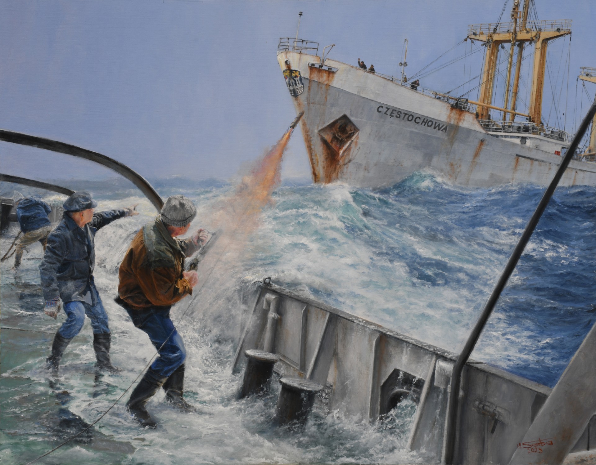 Takiej sytuacji jak tej wyżej przedstawionej nie można spotkać generalni w światowym malarstwie marynistycznym, po prostu jest nieznana artystom nie będącym marynarzami - wiec postanowiłem namalować ową sytuacje “łapania” urwanej z holu jednostki, a w tym wypadku była to właśnie “Częstochowa”. Ciężkie warunki pogodowe nie pozwalały na bliskie podejście holownika m/s “Jantar” (3150 KM!) aby przekazać ręcznie pierwszą łączącą linę pilotową na pokład statku holowanego. Do tego celu używaliśmy “Schermuly Rocket Aparatus” określając prosto, specjalistyczny karabin z rakietą która po wystrzale ciągnęła za sobą cienką, ale bardzo mocną linkę pilotową na odległość około 70 metrów . System „Schermuly” byl znany juz przed II Wojna Światowa i obecnie są nowe i lepsze środki, ale w tamtych latach „Schermuly” był tym co mieliśmy i powszechnie pracował dobrze. Niestety trzeba bylo mieć szczeście oraz załoga drugiego statku musiała uważac gdyż lot nie byl kontrolowany i siła uderzenia rakiety byla duża. Na obrazie ratownik wystrzeliwuje rakietę (polla holowniczy "Jantara") z liną w stronę oczekującej załogi na pokładzie “Czestochowy”. Dwójka członków załogi jest zajęta wystrzeleniem rakiety - uważając jednocześnie na rozwijanie się z dużą szybkością linki pilotowej, specjalnie fabrycznie ułożonej w pudle, a trzeci członek załogi przygotowuje linę #2, która będzie przekazana na końcu liny pilotowej i wciągnięta ręcznie lub mechanicznie zależnie od możliwości (na "Częstochowie" była czynna energia elektryczna) i dopiero wówczas w kolejności lina #2 była używana do przekazania stalowej liny holowniczej o średnicy 50mm, wadze 7 ton (cała).