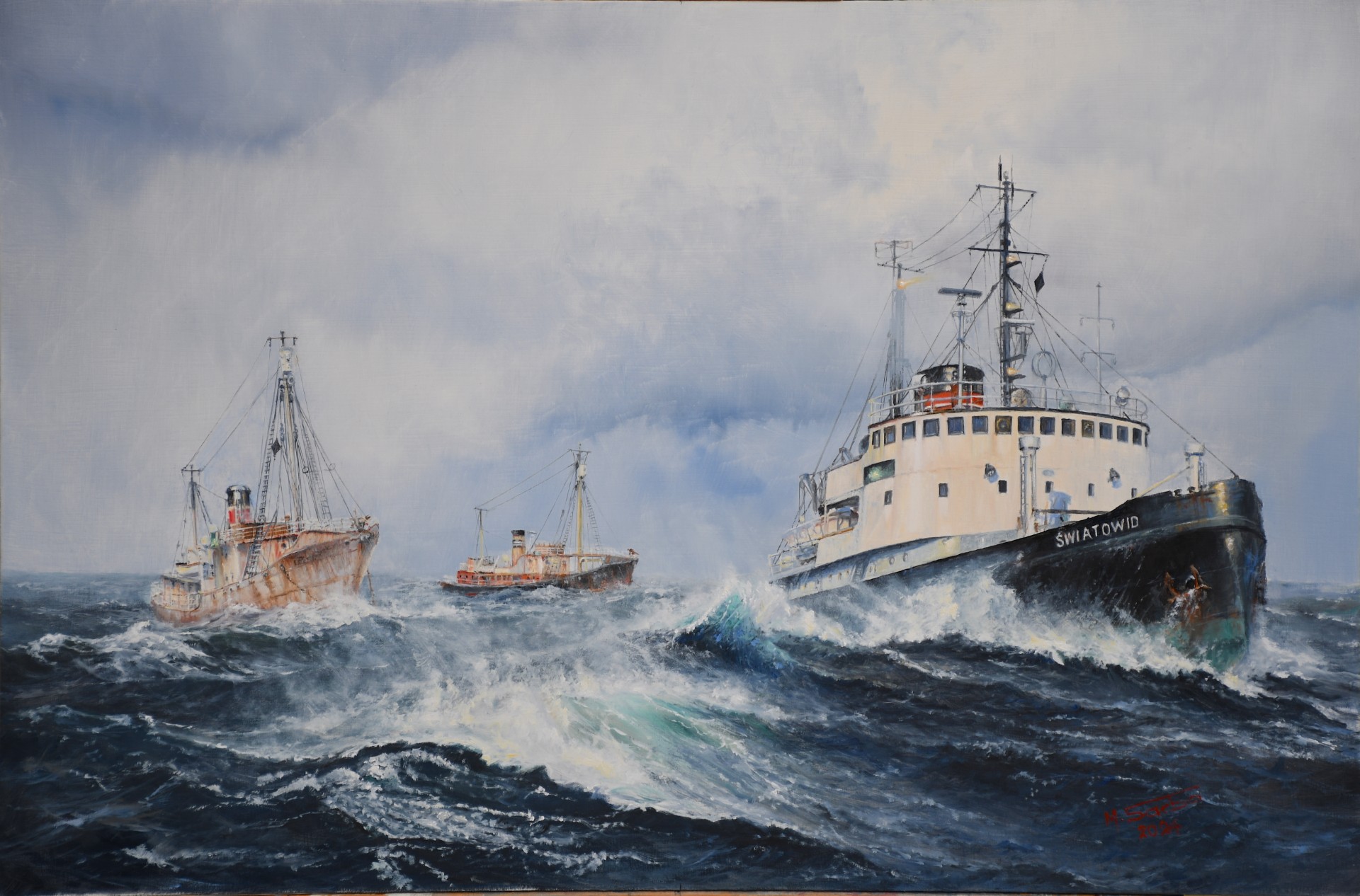 Otóż w roku 1975 od 6 maja do 19 maja odbyło się typowe holowanie morskie na trasie z Alesund (Norwegia) do portu Marino (Hiszpania). Podczas rejsu nic nadzwyczajnego się nie zdarzyło za wyjątkiem napotkanych statków, których zbyt często na tych wodach sie nie spotyka. Jednostką holującą był parowy lodolamacz Polskiego Ratownictwa Okrętowego “Swiatowid” zbudowany w Oskarsham (Szwecja) w roku 1951. Długość 47.7 metra, 883 GRT, tłokowa maszyna parowa typu H59 o mocy 2600 KM. Zakres rejonu żeglugi Bałtyk i Morze Północne. Po okresie sezonu “lodow” ratownictwo często zatrudniało lodołamacze do pracy holowniczej, ale rzadko można było zobaczyć “Swiatowida” przy takim zadaniu. Jednostkami ciągniątymi byly dwa norweskie statki wielorybnicze - sprzedane na złom, a wiec to była ich ostatnia podróż. Statkami tymi były D/h “Star III” and D/h “Polaris” - poławiacze wielorybów o długości około 40 metrow i wyporności 300 GRT. Ten obraz jest również pożegnaniem “Swiatowida” który 11 lat po tym holowaniu sam trafił pod palnik stoczni złomowej w Vigo. Nie byłem nigdy członkiem załogi tego lodołamacza (nie był wymagany oficer elektryk) ale kilka razy oglądałem wnętrza w czasie odwiedzin znajomego. Dziś załuje ze nie uwieczniłem nic z maszynowni lub mostku bo były pełne ciekawostek. Zostały wspomnienia. Do namalowania obrazu otrzymałem pomoc od dobrego znajomego, byłego oficera norweskiej marynarki handlowej - Pana Svein Berge, który pomógł mi w części dotyczących statków wielorybniczych.