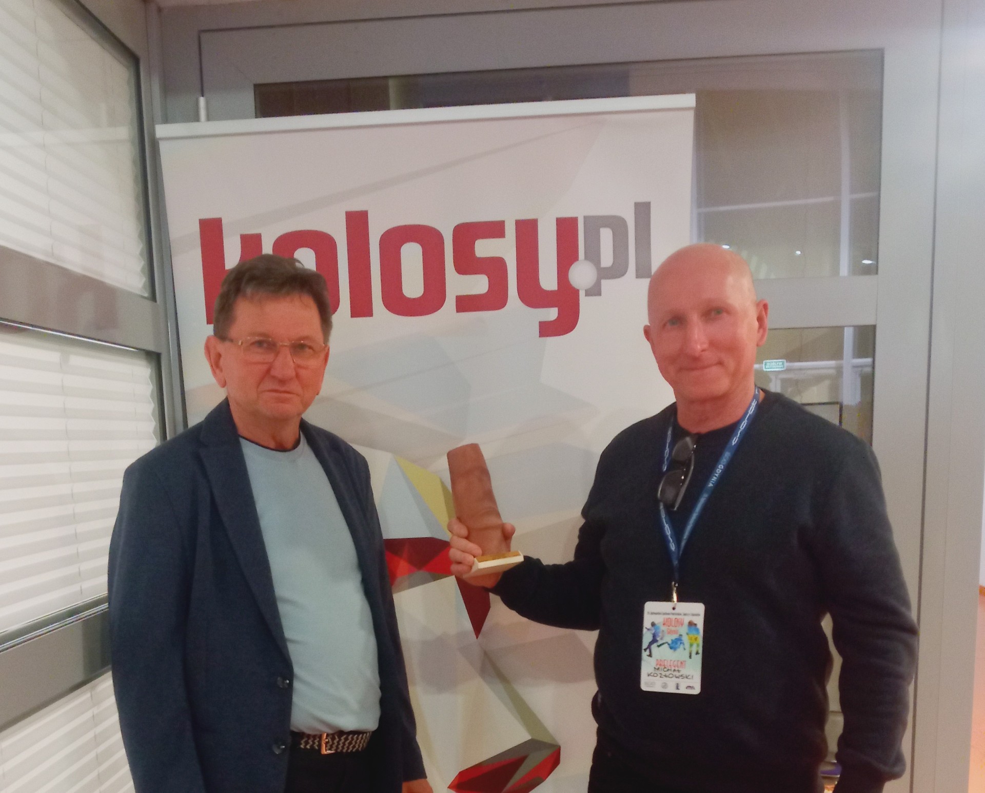 Redaktor z radia Koszalin zaprosił nas na wywiad na niedzielę, tylko kazał przynieść statuetkę. Na moją uwagę, że to przecież radio się tylko zaśmiał. Wspomniał, że da mi linka do nagrania a będzie w poniedziałek w radio. Okazało się, że zrobili małe studio z kamerą i reporterami. Dziesięć minut rozmowy i wychodzimy. Zaraz dzwoni córka kumpla mówiąc, że już nas wysłuchała. Znaczy jednak na żywo poszło… Dobrze, że nie wiedziałem, bo bym się bardziej denerwował. Trzy dni a tyle emocji. „Kolosy” wpisuję na listę imprez koniecznych do odwiedzania.
